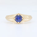 A richly colored sapphire is set at the center of this distinctive signet-inspired design, offering a refined yet bold presence. The 0.49ct sapphire is framed within a knife edge silhouette that draws the eye inward while enhancing the stone’s depth of color. Hand engraved detailing flows along the shoulders, adding texture and a sense of craftsmanship that elevates the piece beyond a traditional solitaire. Crafted in 14K yellow gold, the warm metal complements the sapphire’s vivid tone and gives the ring a timeless, heirloom quality. Structured yet artistic, this design blends classic form with intricate hand finished detail.